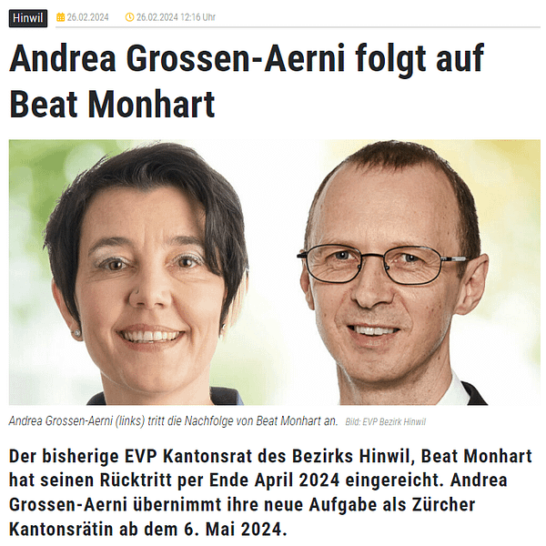 Der bisherige EVP Kantonsrat des Bezirks Hinwil, Beat Monhart, Gossau, hat auf Ende des laufenden Amtsjahrs per Ende April 2024 seinen Rücktritt aus dem Zürcher Kantonsrat eingereicht.